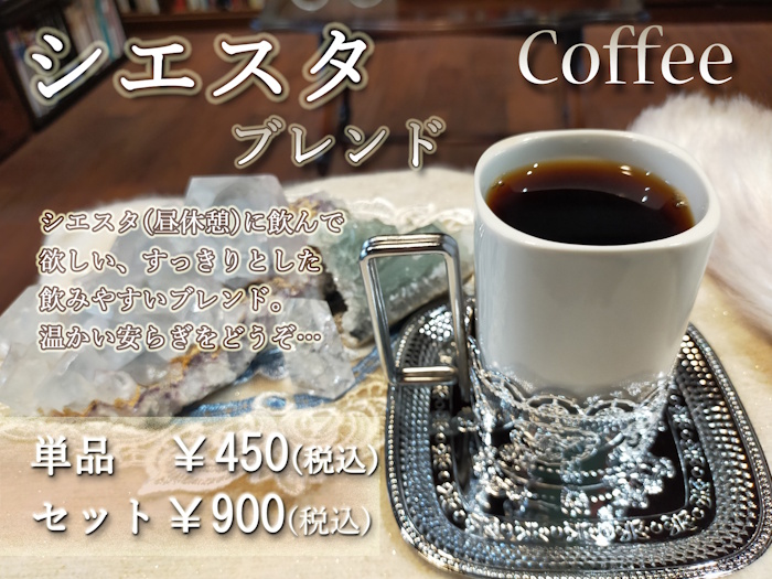 「シエスタ」は前回のブレンドコーヒーと同様、西尾市のCoffee Pro様 (旧コーヒーフレーバー) のブレンドとなります。コーヒーの神と呼ばれる方のお店なので、厳選された良い豆ですよ…!本来の名称は「ホットな小休止」ですが、私が「シエスタ」と変更させていただきました。