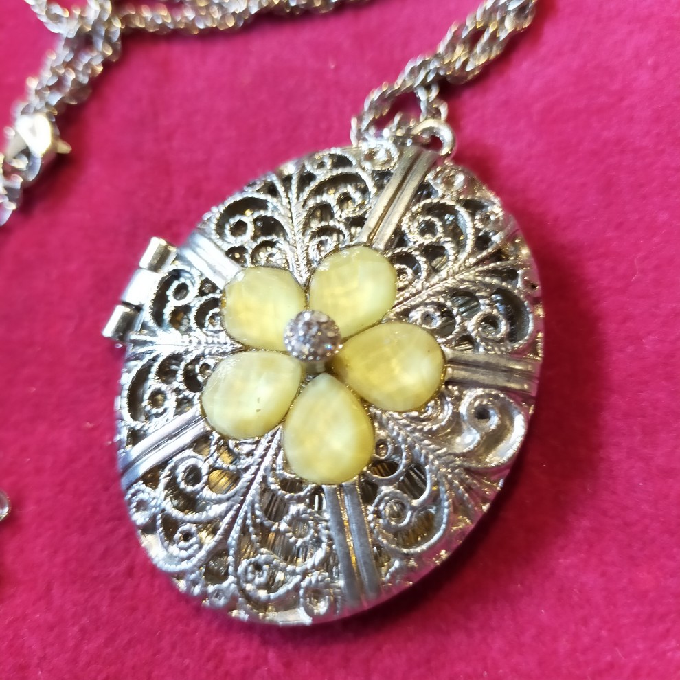ヴィンテージのロケットペンダントです。 中に写真などを入れることができます。 透かしの装飾が美しいです。 右の止め部分はマグネット。真ん中の黄色い部分は石ではなく、樹脂かと思われます? 印字はなし。ネックレスのチェーンの長さは約80cm。ペンダントのサイズは約4.7cm