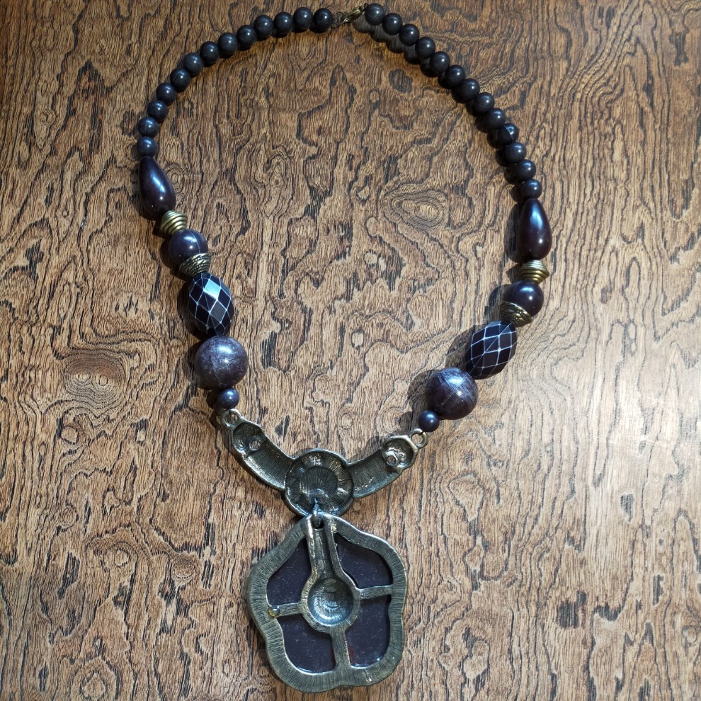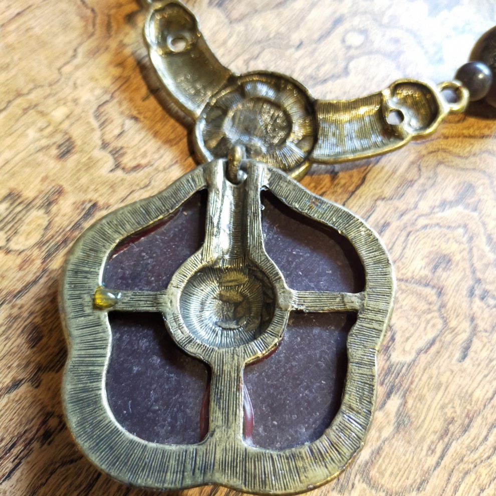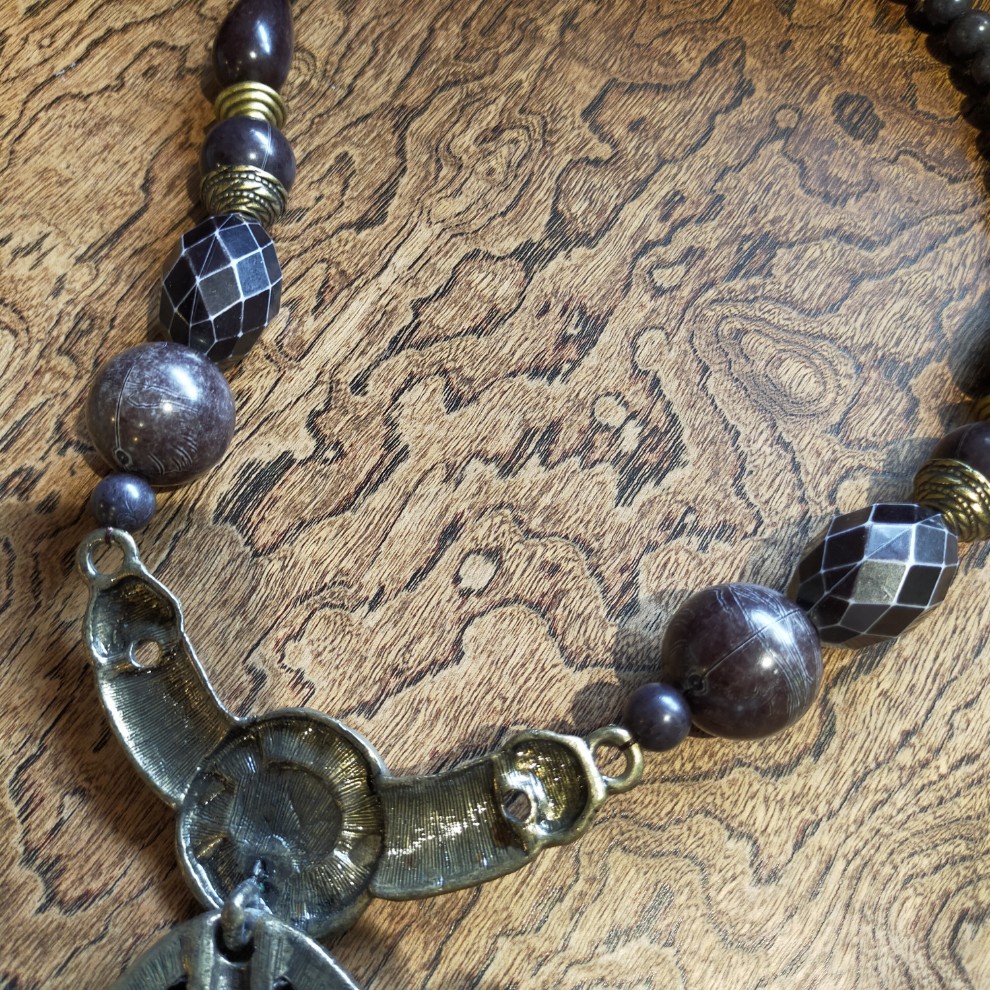 ブロンズ色の金属、マットな色合いをしたストーン、黒色のビーズなどが使われています。重さは約187g。刻印はありません。